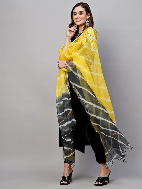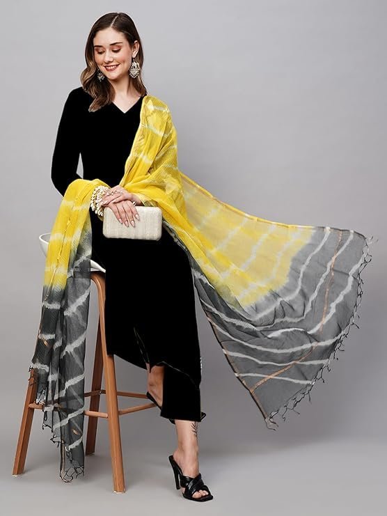 Women’s Rayon Viscose Straight Solid Kurta with Pant & Dupatta, Black/Yellow